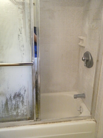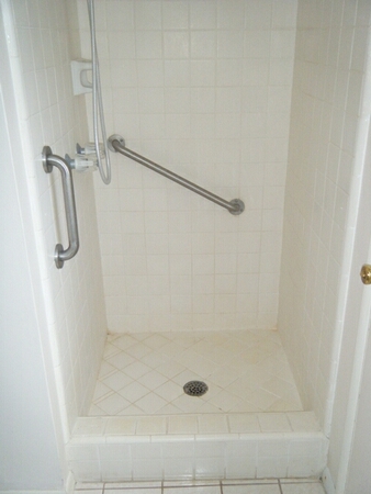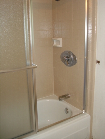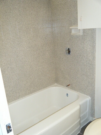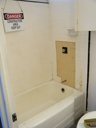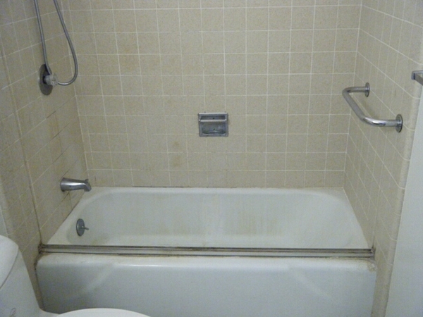 The existing caulking is removed, and the tub and walls are recaulked